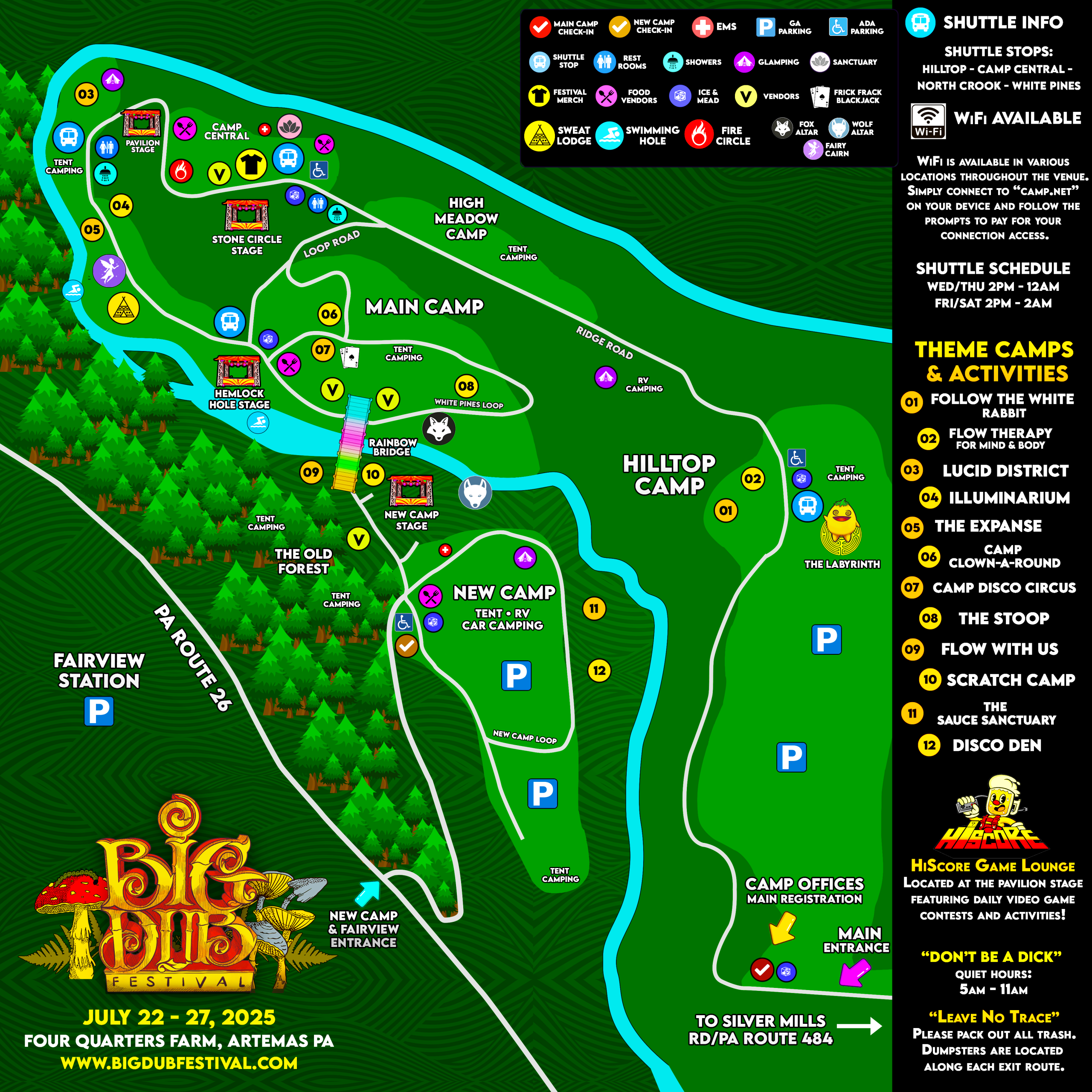 Main Camp arrivals can drive in to camp to unload only on Tuesday/Wednesday until 8pm and then again Sunday after 9am pack out. There are no exceptions to this rule for safety reasons.